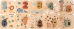 Drevené počítacie puzzle so zvieratkami prepája učenie s hrou. Každý štvorcový dielik z prírodného dreva zobrazuje číslo a rovnaké množstvo rozkošných motívov – napríklad 9 žaludí s veveričkou, 8 motýľov s kvietkom a 7 žabičiek. Deti si tak ľahko osvoja rozpoznávanie čísel a základy počítania.