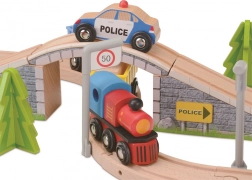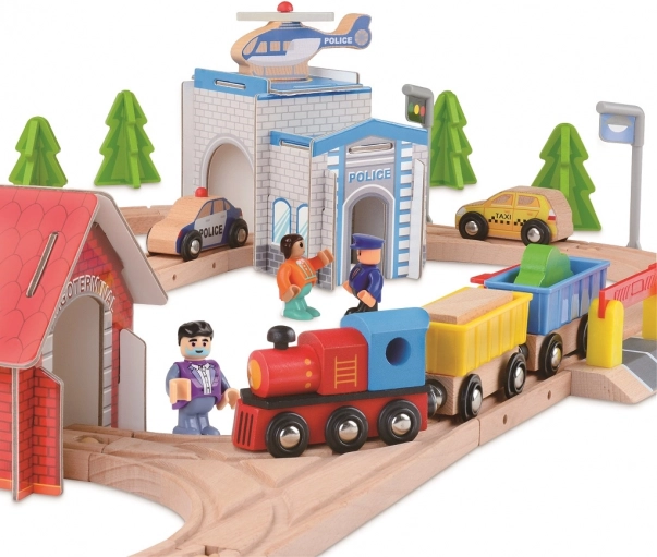 Táto detailne prepracovaná vláčkodráha ponúka kompletný svet na koľajniciach: lokomotívu s vagónmi, autá, postavičky, policajnú stanicu, heliport, stromy aj dopravné značenie. Deti môžu naložiť náklad, prejsť cez vyvýšený most, zastaviť pri stanici a bezpečne prekonať priecestie so závorami. Každá jazda sa zmení na nový príbeh a rozvíja logiku, koordináciu oko–ruka aj komunikáciu pri spoločnej hre.