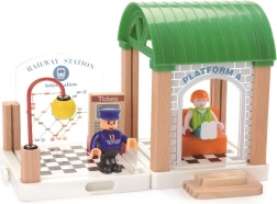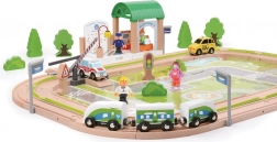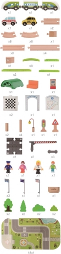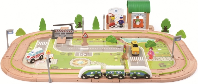 Táto drevená vláčkodráha prináša deťom bohatý herný svet, kde každý deň vzniká nový príbeh. Nechýba vláčik s tromi vagónmi, stanica, zdvíhacia závora, taxi, sanitka, semafory, dopravné značky, stromy ani figúrky ľudí. Všetko dopĺňa potlačená podložka s ulicami a priechodmi, ktorá uľahčuje stavbu aj orientáciu v hre.