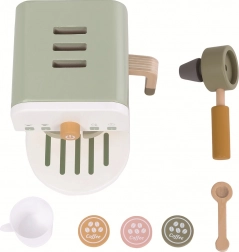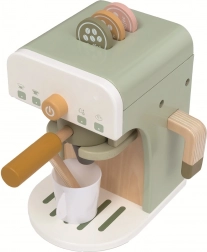 Kvalitné materiály (prírodné drevo, MDF a preglejka) a príjemné pastelové farby zabezpečia, že kávovar krásne zapadne do detskej izbičky. Set obsahuje všetko potrebné na „prípravu“ kávy a inšpiruje k role-play aktivitám, ktoré podporujú komunikáciu a rozvoj fantázie.
