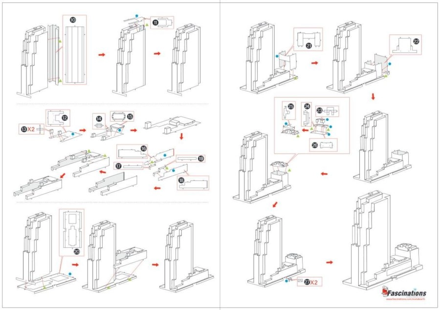 Skladanie prebieha bez lepidla: diely vyberiete z plátkov, spojíte ich pomocou zámkov a háčikov a ohnete ich malými kliešťami pre pevné uchytenie. Vďaka laserovému gravírovaniu vyniknú charakteristické detaily slávneho mrakodrapu v Midtown Manhattane.