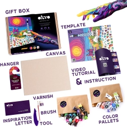 - Prírodné plátno, obrázkový návod, modelovací nástroj, sada samoschnúcej modelovacej hmoty, akrylový lak 20 ml, štetec