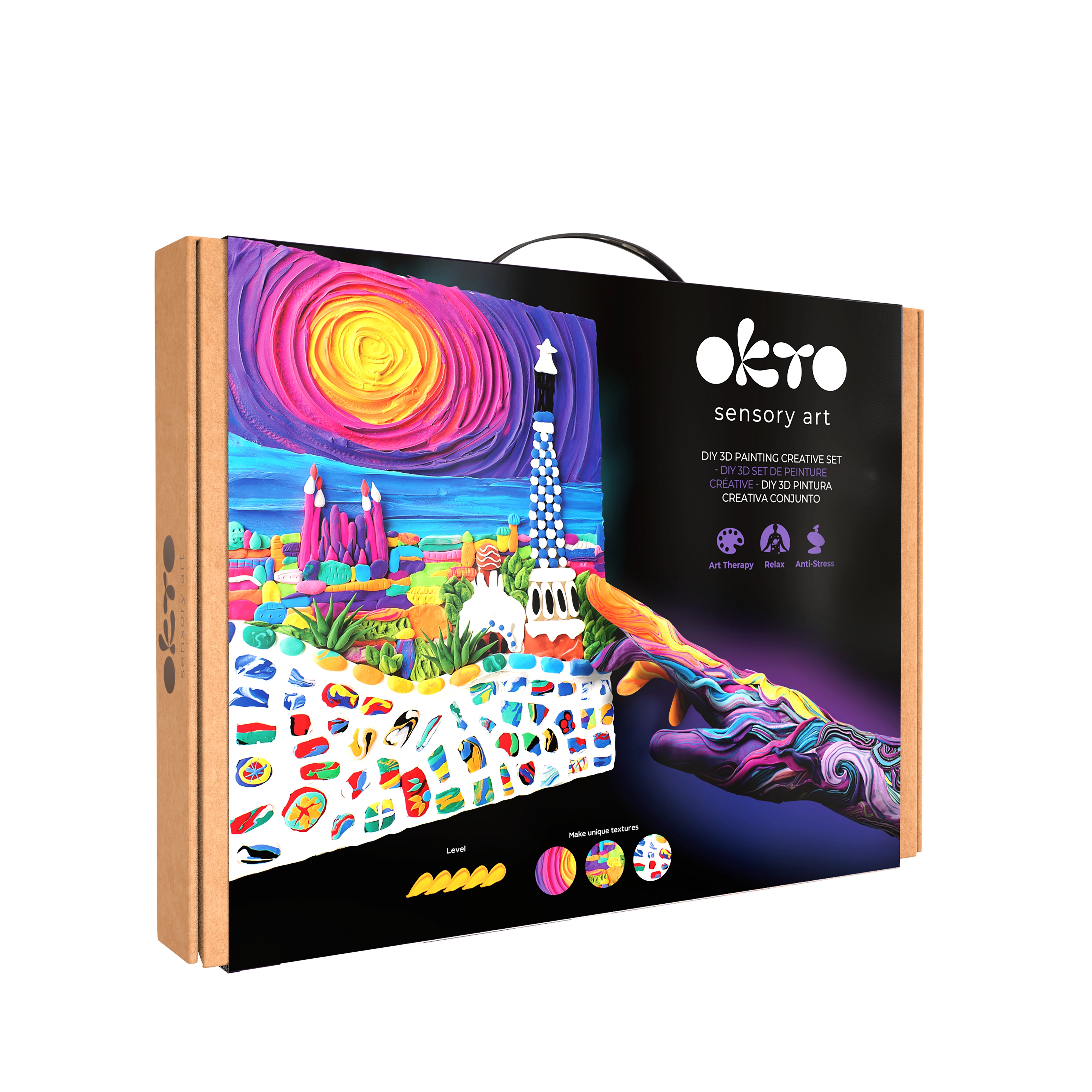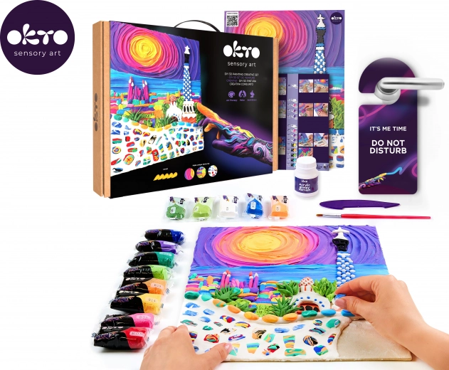 Táto prémiová kreatívna sada OKTO vám umožní vytvoriť plastický obraz s jedinečnou textúrou a hravými detailmi inšpirovanými architektúrou Barcelony. Vďaka samoschnúcej modelovacej hmote dosiahnete pôsobivý 3D efekt, ktorý po nalakovaní akrylovým lakom vynikne s dlhodobou ochranou.