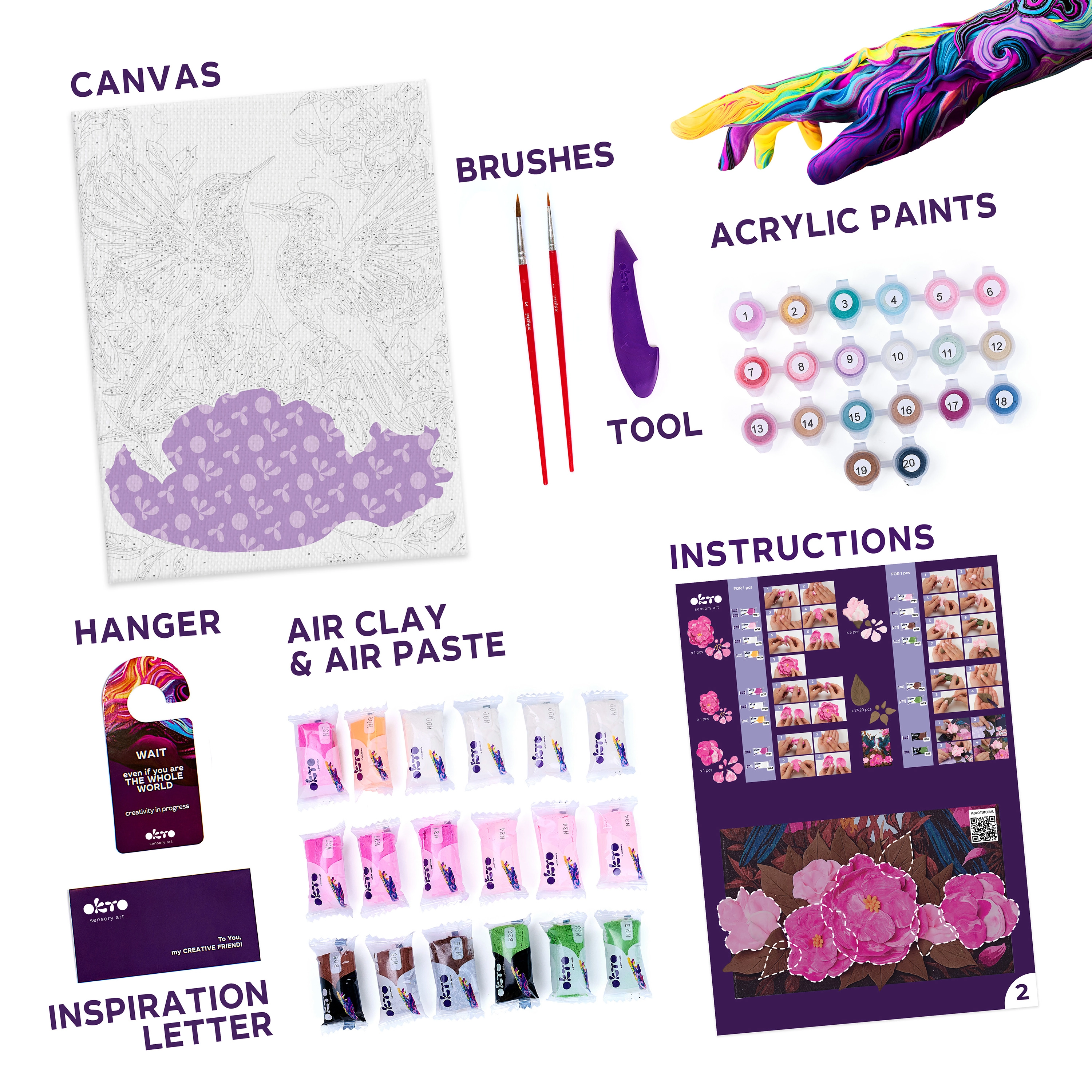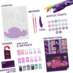 Sada je kompletná – obsahuje všetko, čo potrebujete od plátna a farieb až po modelovaciu hmotu a nástroje. Je ideálna ako kreatívny darček aj ako vlastnoručne vytvorená dekorácia do bytu.