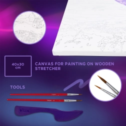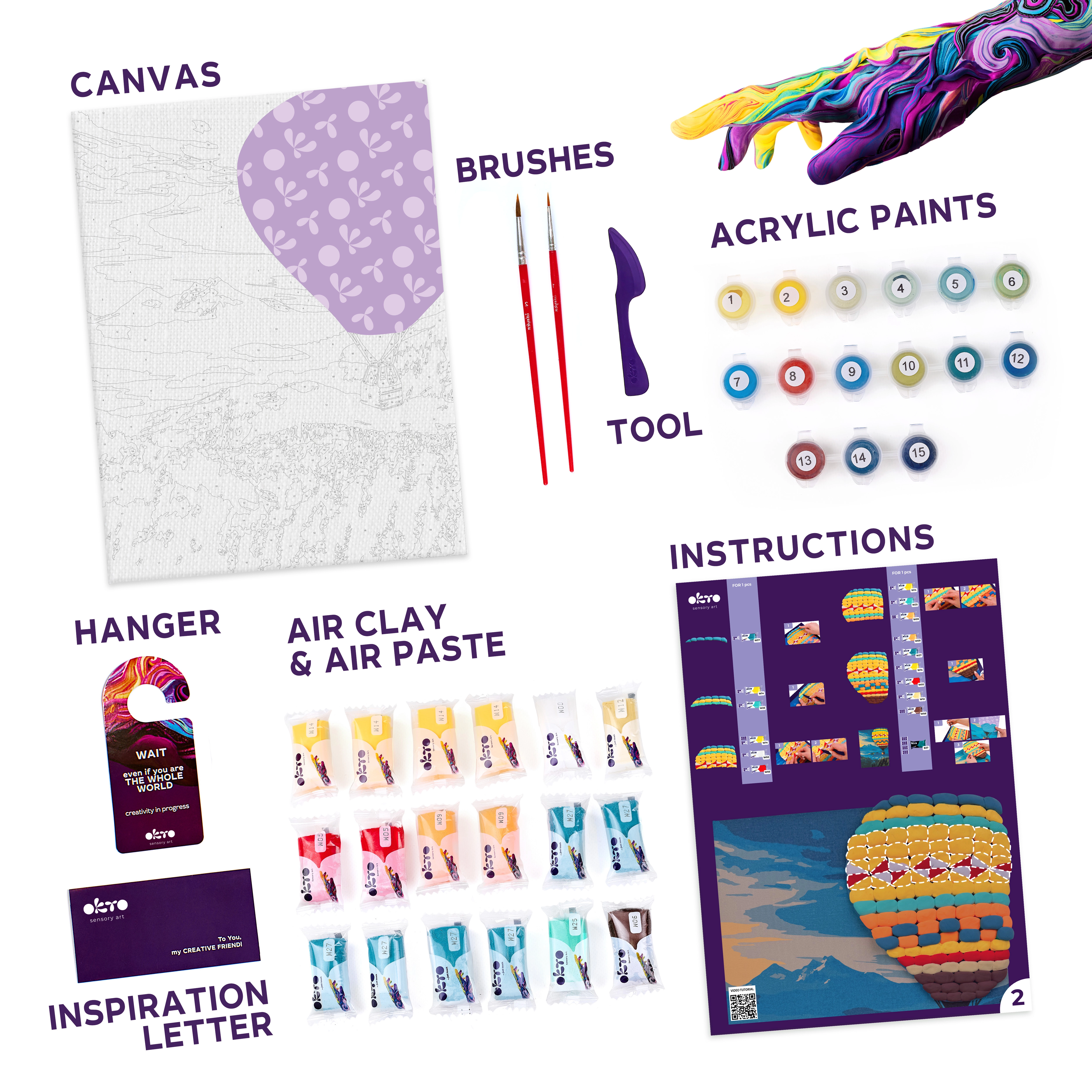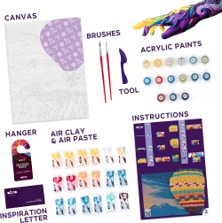 Všetko potrebné nájdete v balení: kvalitné plátno s predtlačenou predlohou, samoschnúca modelovacia hmota na plastické časti balónu, farby a štetec, praktický modelovací nástroj a obrázkový návod krok za krokom. Vďaka jasne označeným číslam je postup intuitívny aj pre mierne pokročilých tvorcov.