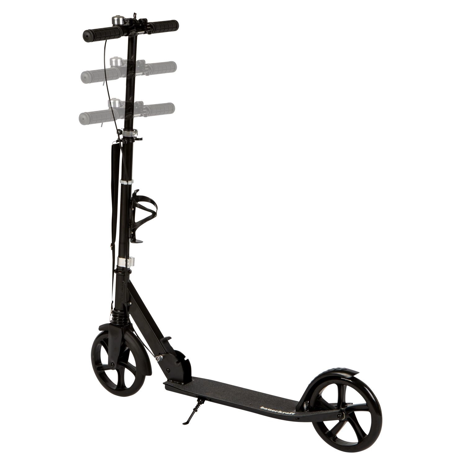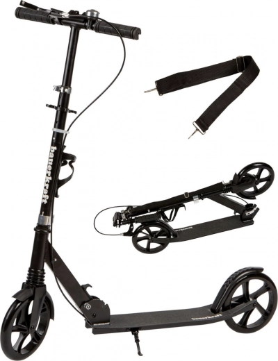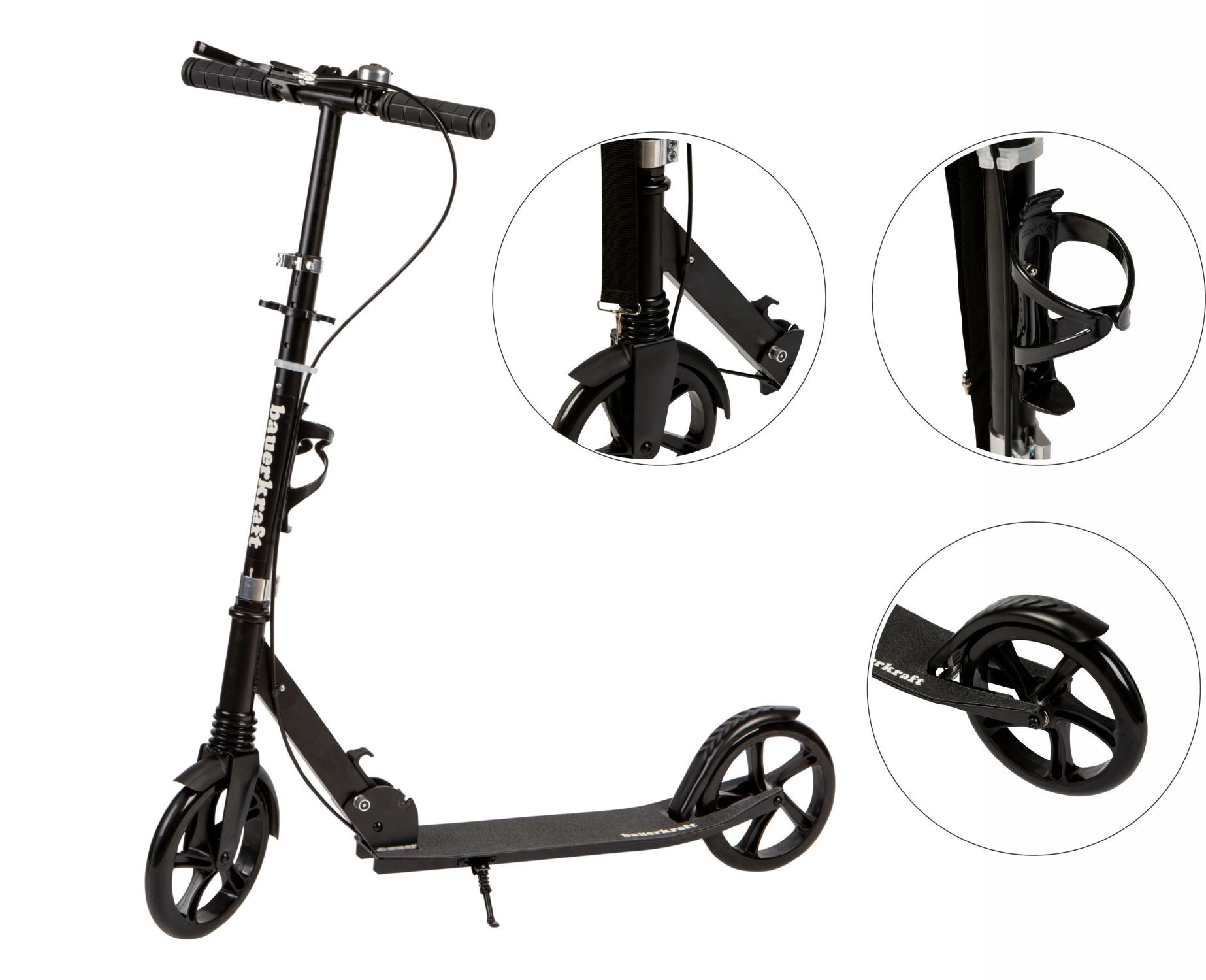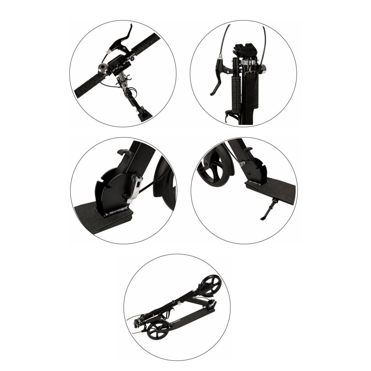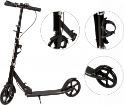 Ľahká mestská hliníková kolobežka pre deti a tínedžerov ponúka veľké 200 mm kolesá s ložiskami ABEC-7, nastaviteľné riadidlá 95–105 cm, predné odpruženie a skladací rám. Pre bezpečnú jazdu nechýba ručná aj nášľapná brzda, protisklzová doska, stojanček, zvonček a praktický držiak na fľašu. Maximálna nosnosť 80 kg.