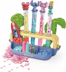 Objavte zábavnú továreň na perá vo verzii Stitch a navrhnite si vlastné písacie potreby plné farieb a trblietok. Sada obsahuje všetko potrebné: od priehľadných tiel pier cez farebné atramenty až po rozkošné gumové postavičky a samolepky pre jedinečný vzhľad.