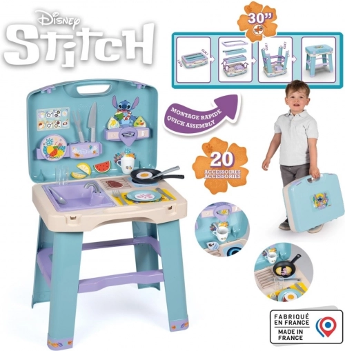 Táto detská kuchynka sa premení z kufríka na plnohodnotné kuchynské štúdio v niekoľkých jednoduchých krokoch – stačí ju rozložiť, nasadiť nožičky a varenie môže začať. Veselý motív DISNEY STITCH podporuje fantáziu a role-play, takže si deti užijú hodiny zábavy.