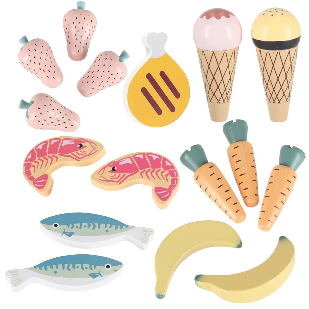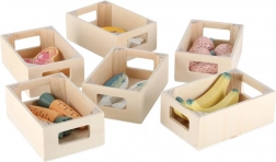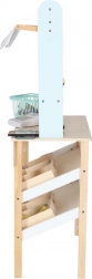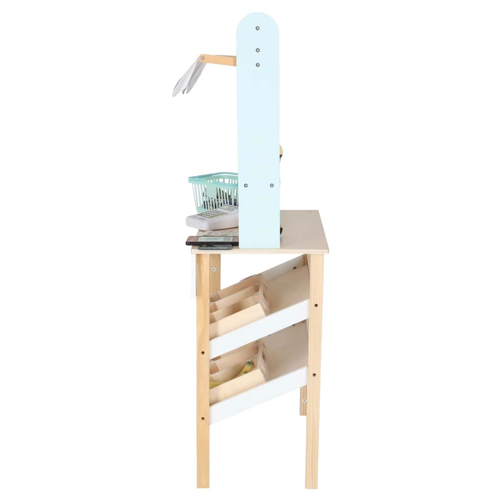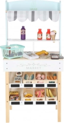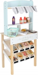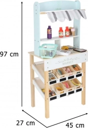 Štýlový drevený obchodný stánok pre malých predavačov prináša hodiny kreatívnej zábavy. Vďaka pevnej drevenej konštrukcii, 6 policiam s košíkmi, pokladni, skeneru a platobnej karte si deti vyskúšajú nákupy ako v skutočnom supermarkete. Súčasťou je bohaté príslušenstvo – ovocie, zelenina, ryby, dezerty a nápoje, košík aj hracie peniaze, ktoré podporujú rozvoj fantázie, sociálnych zručností a jemnej motoriky.