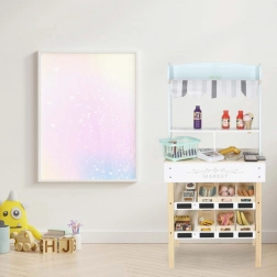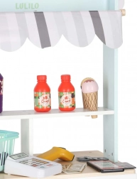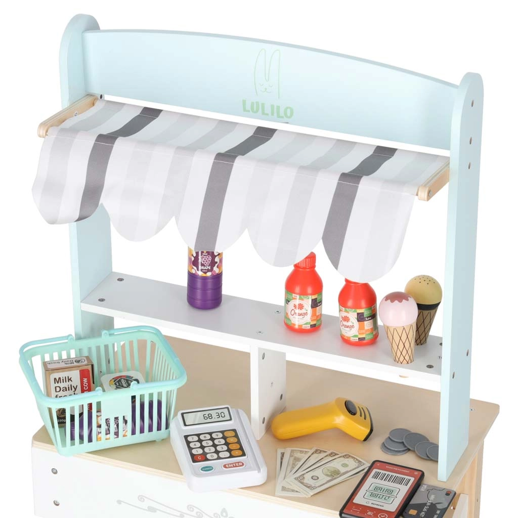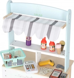 Detský drevený stánok LULILO Melo je krásne spracovaná hračka s látkovou markízou v jemných farbách, ktorá premení detskú izbu na malý supermarket. Ponúka stabilnú konštrukciu z MDF, praktické úložné košíky a prehľadný pult na markovanie nákupu.