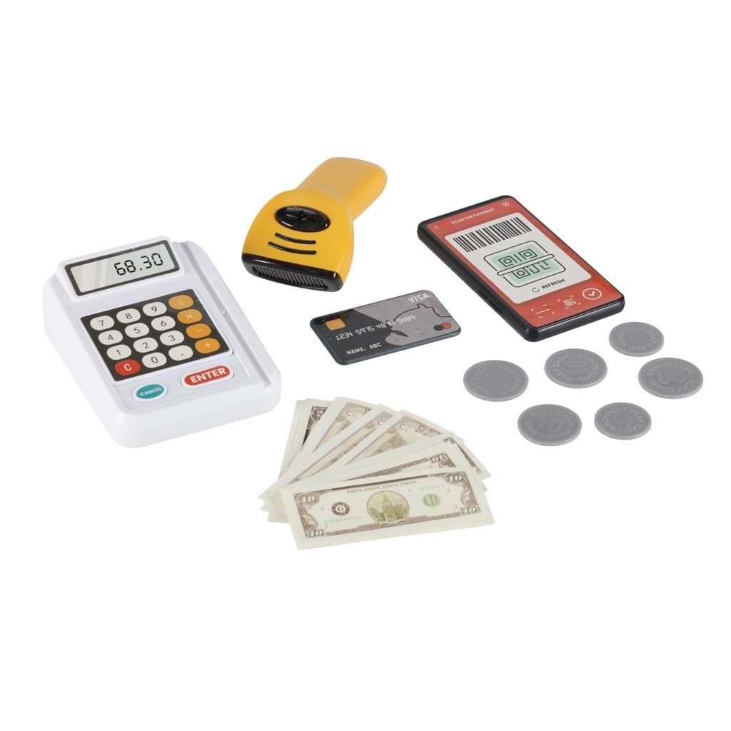 Bohatá sada doplnkov zahŕňa pokladňu s tlačidlami, ručný skener, platobnú kartu, papierové bankovky a plastové mince, nákupný košík aj rozmanité potraviny (ovocie, zelenina, mäso, ryby, jogurty, sušienky, pizza a zmrzlina). Deti sa naučia základy počítania, obchodu a komunikácie.