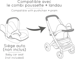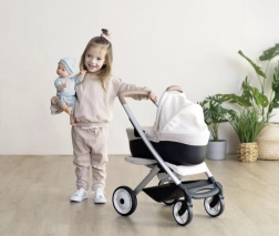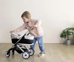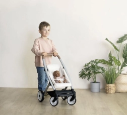 Štýlový kočík pre bábiky 3 v 1 s vymeniteľnou vaničkou a možnosťou rýchlej prestavby na športový kočík. Ponúka otočné predné kolieska pre jednoduché manévrovanie, tichý chod vďaka protihlukovej vrstve kolies a ergonomickú rukoväť vo výške 65 cm. Poťahy z odolnej plastovej tkaniny možno jednoducho utrieť vlhkou handričkou. Vhodné pre bábiky do 42 cm.