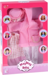 Elegantný ružový set oblečkov bol navrhnutý pre bábiky vysoké 36–40 cm a dokonale kombinuje štýl, pohodlie a ľahkú manipuláciu. Šaty s jemnou ružovo-bielou kockou dopĺňa tylový volán, čipkované pančušky dodajú slávnostný nádych a textúrovaný kabátik s kapucňou a vreckom zahreje počas „studených dní“ vo svete hry. Klobúčik s mašľou všetko krásne zjednotí.