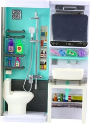 Tento detailne spracovaný kúpeľňový set prenesie deti do sveta každodenných činností. Nájdú v ňom toaletu, umývadlo so zrkadlom s podsvietením, sprchu a pestrú sadu doplnkov na starostlivosť o telo a zuby. Interaktívne svetlá a zvuky dodávajú hre na autentickosti a zábave.