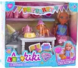 - Kompletná výbava na oslavu – bábika, psík, mačiatko, stôl, 2 stoličky, stolový set, čiapočky a misky.