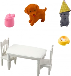 - Bábika, 2 zvieratká (pes a mačka), stôl, 2 stoličky, stolová výbava, narodeninové čiapočky, misky pre zvieratká, originálne balenie