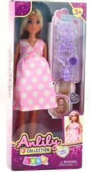 Táto bábika ANLILY v tehotenstve je skvelá hračka na kreatívne hranie rolí a starostlivosť o bábätko. Má otočné bruško s vyberateľným bábätkom, je oblečená do ružových šiat s bielymi bodkami a súčasťou sú praktické doplnky ako cumlík, hrkálky, fľaštička, tanierik a príbor. Kvalitné spracovanie zaručuje dlhú životnosť a bezpečnú zábavu.