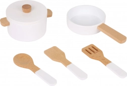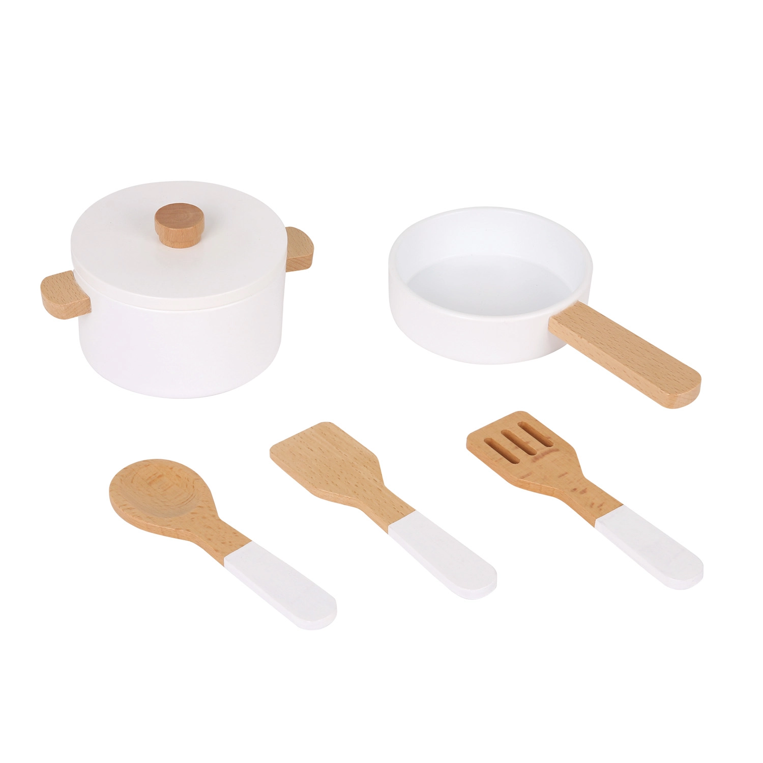 Súčasťou setu je všetko, čo malí kuchári potrebujú: zlatý drez s kohútikom, varná doska s otočnými gombíkmi, rúra s priehľadnými dvierkami, 3 drevené kuchynské nástroje, uterák, soľnička, korenička a dva hrnce s pokrievkou. Materiál je zo 100 % certifikovaného dreva FSC pre bezpečnú a udržateľnú hru.