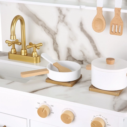 Táto moderná drevená kuchynka prináša deťom autentický zážitok z varenia v bezpečnom a estetickom prevedení. Mramorovaný vzhľad pracovnej dosky a pozadia dodáva kuchynke prémiový dizajn, ktorý skvele zapadne do detskej izby aj obývačky. Deti môžu variť, miešať, piecť aj umývať riad a napodobňovať tak dospelých v domácnosti.