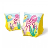 Rukávky majú hravé ilustrácie medúz, chobotníc a krabov v žiarivých farbách na žltom pozadí, čo deti povzbudzuje k plávaniu.