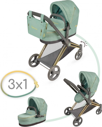 Elegantný detský kočík pre bábiky 3 v 1 z kolekcie CAPRICCIO v modernej mentolovo zelenej farbe ponúkne hlbokú vaničku, športové sedenie aj prenosnú vaničku. Má polohovateľnú striešku, otočné predné kolieska pre ľahké manévrovanie, úložný košík a odnímateľnú tašku so zlatými zipsami. Vďaka skladacej konštrukcii nezaberá miesto a je ideálny pre deti od 3 rokov.