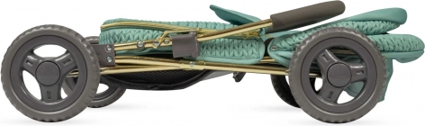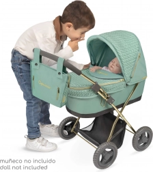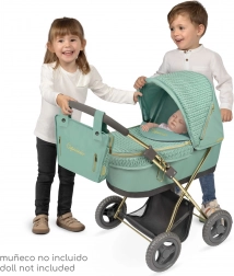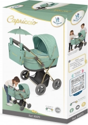 Objavte detský kočík pre bábiky z kolekcie Capriccio 2025 s nezameniteľnou mentolovo zelenou farbou a elegantnými zlatými detailmi. Kombinácia imitácie úpletu a hladkej látky dodáva kočíku luxusný vzhľad, zatiaľ čo ľahký rám a nižšia rukoväť zabezpečujú pohodlné ovládanie aj pre menšie deti.