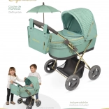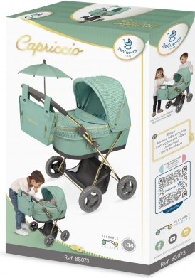 Štýlový kočík pre bábiky z kolekcie Capriccio 2025 poteší moderným dizajnom v mentolovo zelenej, nízkou hmotnosťou a jednoduchou manipuláciou. Ponúka skladaciu konštrukciu, slnečník, odnímateľnú tašku so zlatými zipsami, mäkký matrac a praktický úložný kôš – ideálny pre menšie deti od 3 rokov.