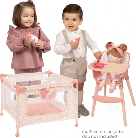 Súprava zahŕňa pevnú hraciu ohrádku so sieťovanými bočnicami a praktickým vreckom na drobnosti a tiež jedálenskú stoličku s odnímateľným pultíkom a trojbodovým pásom pre bezpečné usadenie bábiky. Obe produkty sú navrhnuté pre bábiky do 36 cm a vynikajú ľahkou manipuláciou aj údržbou.