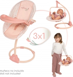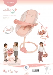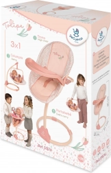Štýlová detská stolička a hojdačka 3 v 1 z kolekcie Tulipe poteší jemným dizajnom aj šikovnou funkčnosťou. Vďaka odnímateľnému obojstrannému sedadlu ju možno využiť ako jedálenskú stoličku, hojdačku aj nosič. Nechýbajú bezpečnostné popruhy, plastový pultík na kŕmenie a ľahká, ale stabilná konštrukcia pre jednoduchú manipuláciu. Ideálne pre bábiky do 50 cm a deti od 3 rokov.
