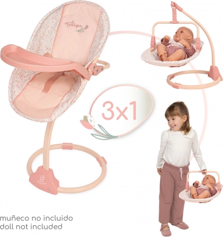 Multifunkčná stolička a hojdačka pre bábiky 3 v 1 z kolekcie Tulipe vyniká nežnými pastelovými tónmi a kvetinovým vzorom, vďaka ktorým krásne zapadne do dievčenskej izbičky. Moderná konštrukcia umožňuje rýchlo meniť režimy hry a podporuje fantáziu aj starostlivosť o bábiku.