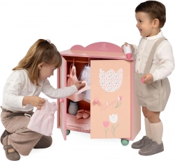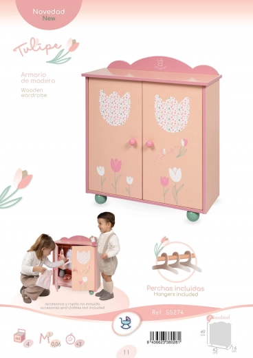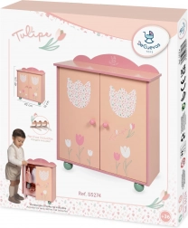 Štýlová drevená šatníková skriňa pre bábiky z kolekcie TULIPE poteší jemným pastelovým dizajnom, precíznym spracovaním a praktickým vnútorným usporiadaním. Súčasťou je šatníková tyč a 3 drevené ramienka na prehľadné uloženie oblečkov. Skvelý doplnok do dievčenskej izbičky, ideálny pre deti od 3 rokov.
