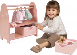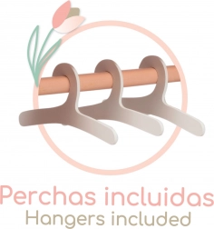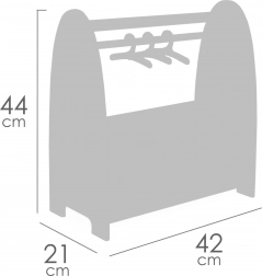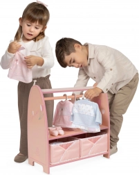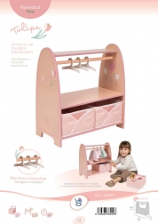 Doprajte deťom poriadok vo svete bábik. Tento kompaktný drevený šatní vešiak z kolekcie TULIPE prináša praktické riešenie na zavesenie aj uloženie oblečkov a doplnkov. Šatní tyč s 3 drevenými ramienkami pojme oblečky do dĺžky cca 19 cm, spodná polica a 2 skladacie látkové košíky udržia všetko ostatné pekne po ruke.