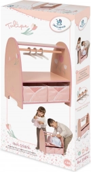 Štýlový drevený vešiak na bábikovské oblečky s jemným tulipánovým motívom skvele zapadne do detskej izbičky. Ponúka šatní tyč s ramienkami, policu a dva skladacie košíky na prehľadné uloženie doplnkov. Vďaka kvalitnému drevenému spracovaniu a pastelovým farbám je ideálny na každodenné hranie a organizáciu výbavy pre bábiky.