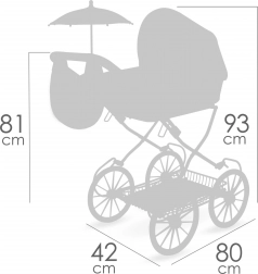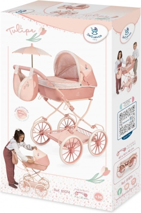 Súčasťou je štýlová taška v tvare tulipánu, skladací slnečník a mäkký matrac pre bábiku. Nechýba odkladacie vrecko na strieške, kryt vaničky s patentkami a priestranný košík pod vozíkom. Veľké lúčové kolesá a pružiny umožňujú plynulé hojdanie a stabilnú jazdu.