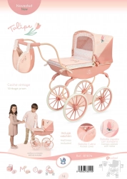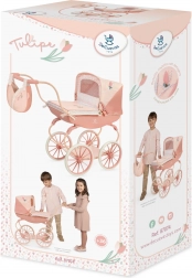 Hlboký kočík pre bábiky z kolekcie Tulipe 2025 vyniká precíznym spracovaním a krásnou kombináciou svetlejších a tmavších lososových pastelov s jemným kvetinovým vzorom. Vďaka pružinám na hojdanie a mäkkej matraci poskytne bábike pohodlné „spinkanie“, zatiaľ čo skladacia strieška a kryt vaničky ju ochránia pri prechádzkach.