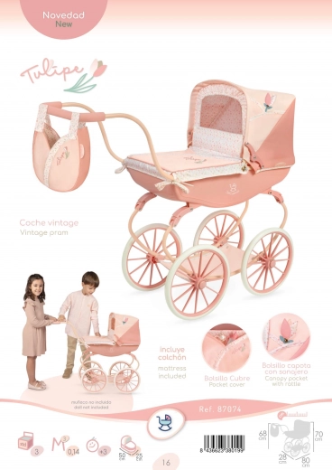 Elegantný kočík pre bábiky DeCuevas Tulipe s výškou k rukoväti 68 cm zaujme nádherným španielskym dizajnom v teplých pastelových tónoch. Ponúka skladaciu striešku, pružinové hojdanie, odnímateľnú tašku v tvare tulipánu a praktický úložný priestor na doplnky. Ideálny pre deti od 3 rokov aj pre milovníkov štýlových doplnkov do detskej izbičky.