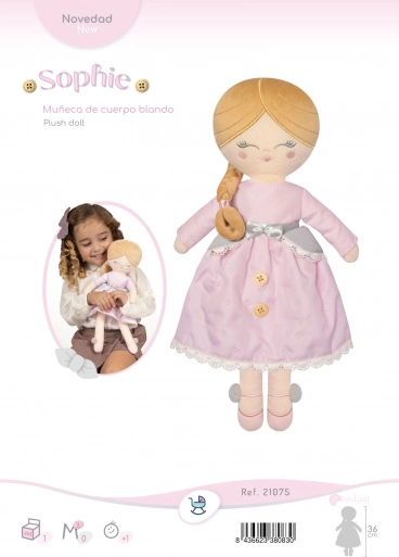 Predstavujeme roztomilú plyšovú bábiku Sophie s veľkosťou 36 cm z novej kolekcie roku 2025. Je vyrobená z vysokokvalitného lesklého plyšu, je mäkká, ľahká a ideálna na túlenie aj cestovanie. Bábika je prateľná ručne na 30 °C a zaujme nežným španielskym dizajnom v odtieňoch svetloružovej so sivými a bielymi detailmi.