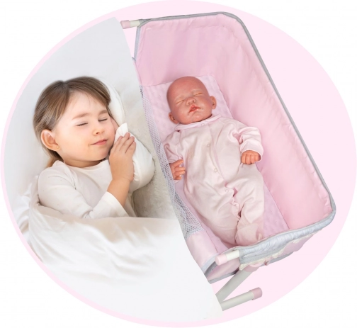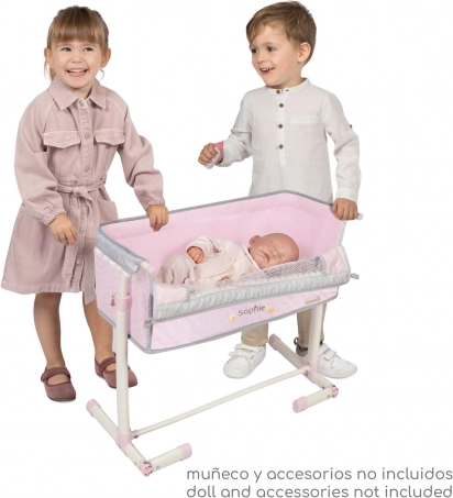Elegantná novorodenecká postieľka pre bábiky zo série SOPHIE poteší jemným dizajnom a praktickou funkciou spoločného spánku. Vďaka sklopnej bočnici, nastaviteľným nohám a výškovo polohovateľnému lôžku ju ľahko prisuniete k detskej posteli. Ľahká manipulácia, kvalitné spracovanie a nežné ružové prevedenie so sivými a bielymi detailmi vytvoria kúzelné miesto pre každú bábiku.