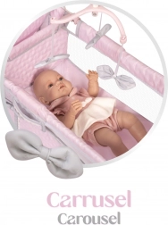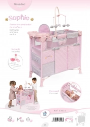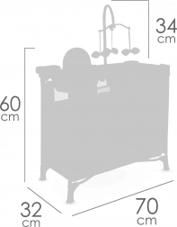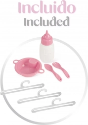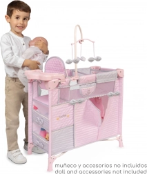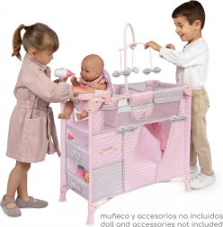 Súčasťou je bohatá výbava na realistickú starostlivosť o bábiky: kolotoč s mašličkami, prebaľovací pultík, jedálenská stolička s plastovým setom, priestranná šatňa na zips s ramienkami a dve úložné poličky. Postieľka má sieťované okienko pre lepší dohľad a ventiláciu.
