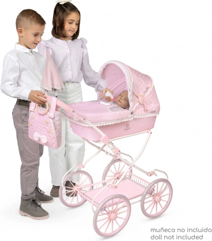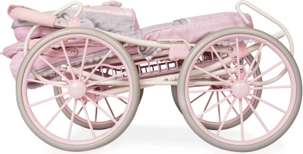 Stabilná konštrukcia z kovu, plastu a textilu je ľahká a jednoducho ovládateľná. Sklápacia búdka, praktický úložný košík a hojdacie pružiny dodávajú hre realistický zážitok. Bohatá výbava zahŕňa všetko potrebné pre štýlové vychádzky s bábikou.