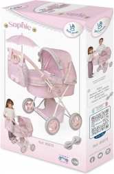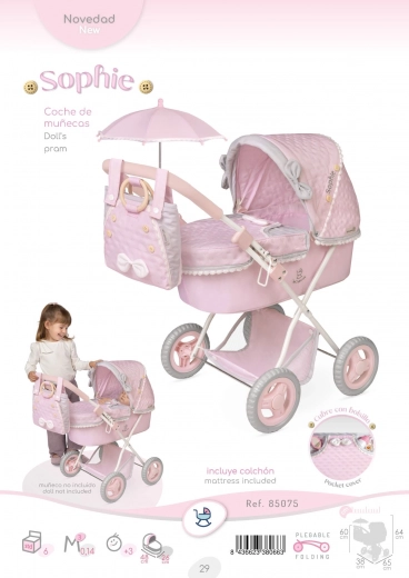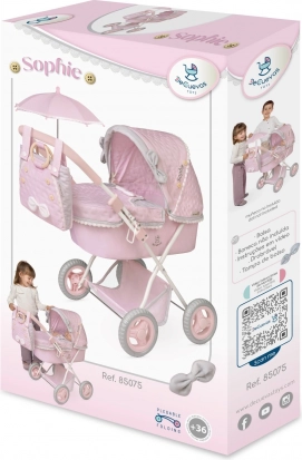 Elegantný kočík pre bábiky z kolekcie SOPHIE poteší jemným dizajnom v ružových tónoch, skladacou konštrukciou a bohatou výbavou. Ponúka slnečník, odnímateľnú tašku, mäkký matrac a úložný priestor v spodnej časti. Vďaka výške rukoväti 60 cm a nízkej hmotnosti sa s ním deťom ľahko manipuluje. Ideálny pre malé slečny od 3 rokov.
