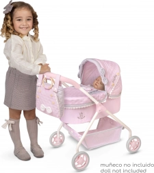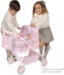 Praktická výbava zahŕňa odnímateľnú tašku na kočík alebo do ruky, kryt vaničky s očkami a vreckami, pohodlný matrac a spodný úložný priestor na drobnosti. Španielsky dizajn a precízne spracovanie zaisťujú dlhú životnosť a radosť z hry každý deň.