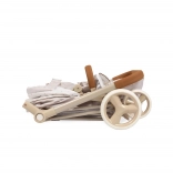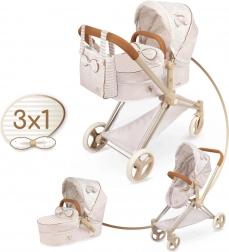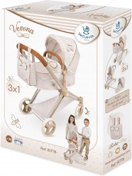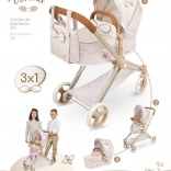 Elegantný detský kočík pre bábiky 3 v 1 z kolekcie VERONA poteší jemným prírodným dizajnom, skladacou konštrukciou a odnímateľnou hlbokou vaničkou, ktorú možno premeniť na športovú verziu. Ponúka polohovaciu striešku, trojbodový pás, otočné predné kolieska pre ľahké riadenie a praktickú tašku aj úložný košík. Skvelá voľba pre deti od 3 rokov.