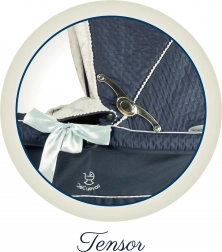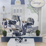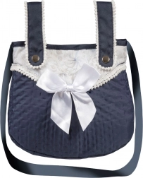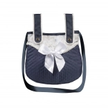 Súčasťou je ozdobne prešívaná taška, ktorú možno pripnúť na kočík alebo nosiť cez rameno. Zjednotený dizajn v tmavomodrej s bielymi detailmi.