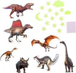 Vytvorte deťom praveké dobrodružstvo priamo na stene. Fluorescenčné dekorácie s dinosaurami a nočnou oblohou sa po krátkom nasvietení rozžiaria jemným svetlom, ktoré navodí pokojnú atmosféru. Inštalácia je hračka – penové samolepiace prvky držia spoľahlivo na stene, strope aj nábytku a po sňatí nezanechávajú stopy.