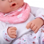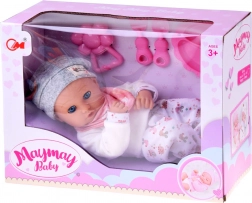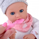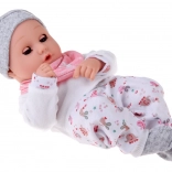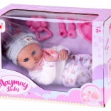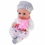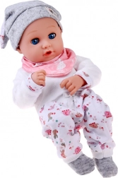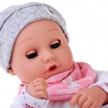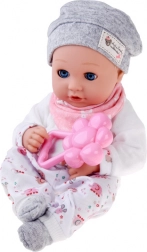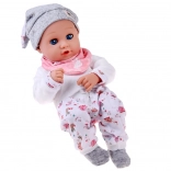 Táto bábika je vyrobená z príjemného, mäkkého materiálu s plastovou hlavou a rukami pre odolnosť. Oblečenie v jemných farbách zahŕňa šedú čiapočku, mäkkú blúzku, vzorované nohavice a šedé ponožky. Vďaka pohyblivým viečkam bábika verne napodobňuje spánok aj bdenie a podporuje prirodzenú starostlivosť a empatiu.