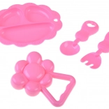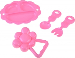 Ružový tanierik, lyžička, vidlička a hrkálka podporujú rolové hry a rozvoj fantázie aj motoriky.