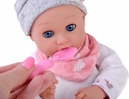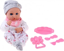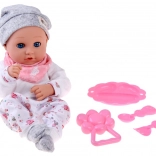 Súčasťou je praktická sada na kŕmenie v ružovej farbe – tanierik, lyžička a vidlička – a tiež hrkálka. Deti si tak môžu naplno užiť rolové hry, rozvíjať fantáziu, jemnú motoriku a sociálne zručnosti.