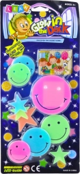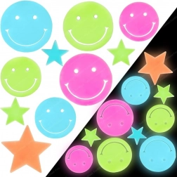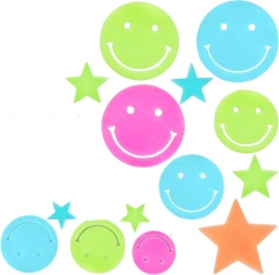 Veselá sada fluorescenčných nálepiek rozžiari detskú izbu a navodí rozprávkovú atmosféru. Po nasvietení vynikne ich jemné svetielkovanie v tme, farebné smajlíky a hviezdičky v rôznych veľkostiach. Vďaka samolepiacim penovým prvkom spoľahlivo držia na stene, strope aj nábytku a možno ich ľahko odstrániť bez stôp. Vyrobené z bezpečných, netoxických materiálov spĺňajúcich európske normy.