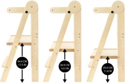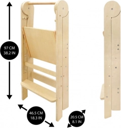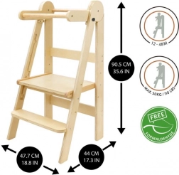 Premyslený dizajn umožňuje deťom bezpečne a samostatne vystúpiť vďaka schodíku vo výške 16 cm. Veža je skladacia, ľahko ju prenesiete z kuchyne do kúpeľne a pri skladovaní zaberá minimum miesta. Testované drevo neobsahuje formaldehyd, takže máte istotu zdravotne nezávadného materiálu.